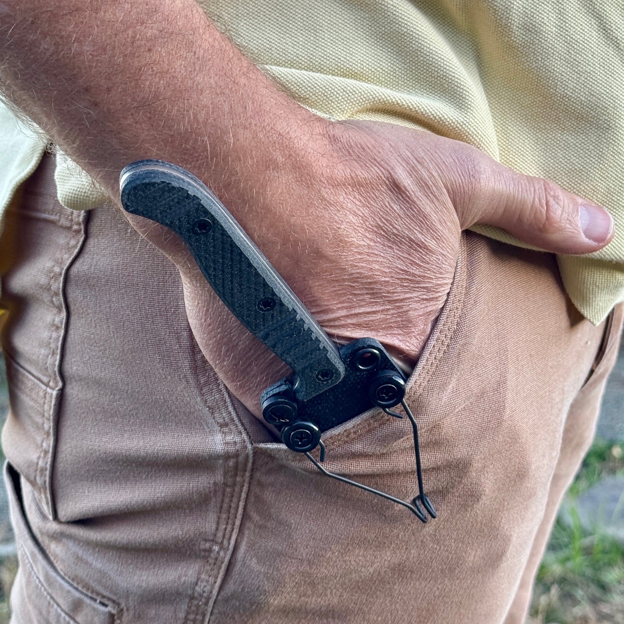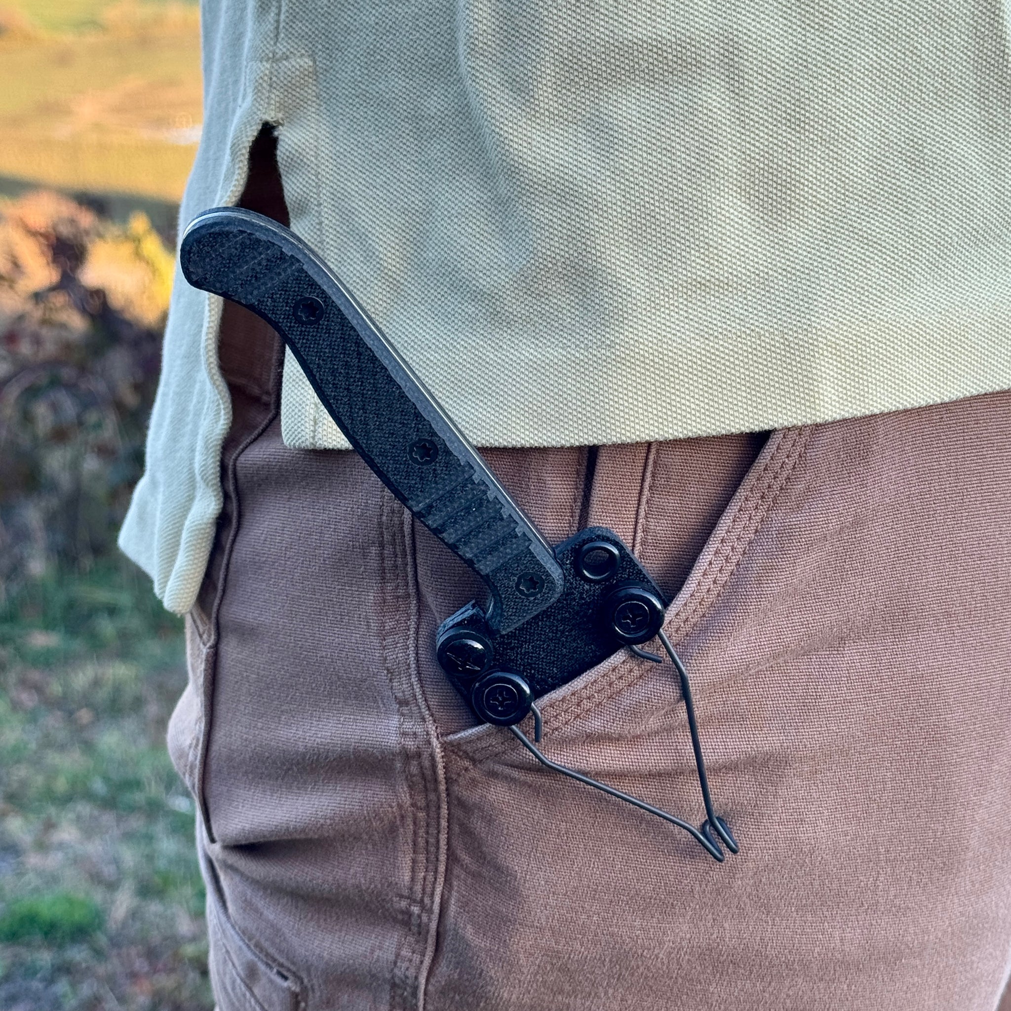 The Wifey's Inzynix™ (Patent Pending) Sheath was designed to be slim and modular. The sheath can utilize different clips to customize and personalize your carry. The first choice is the Ulticlip APH Clip (Awarded 2025 Blade Show Accessory of the Year), an all-purpose clip that can accommodate different mounting directions (horizontal and vertical) with adjustable cant, and can be adjusted for use with 1.5" to 1.75" belts. Next, screw on a Ulticlip Slim 2.2 to get a deep pocket carry or a Ulticlip Slim 3.3 to get some ride height adjustment. The configurations are endless. Just like our sheath, Ulticlip products are proudly made in the U.S.A.!